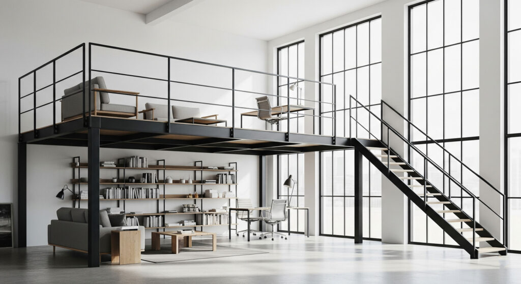 Our residential steel modular mezzanines make it easy to add extra levels to your home, creating dynamic new spaces without the need for major construction. From home offices to additional living rooms, these flexible mezzanines offer a perfect solution to optimize your space. Why not take advantage of your home’s vertical space and turn your attic, basement, or loft into the room you’ve always dreamed of?
